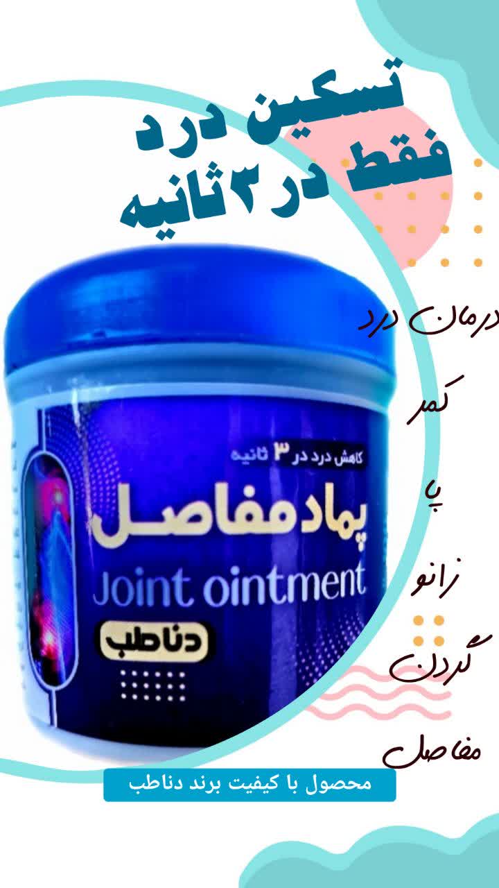 پماد درمان فوری درد مفاصل ابریشم دناطب🔥 😍دیگه نیازی نیست پمادهای فیک و مسکن موقت و پرعوارض بخرید😍 🥰ترکیبات کاملا ارگانیک🥰 😌پمادی بهتون معرفی میکنم که هم مسکن و هم درمان باشه🙃 💫💫💫💫💫💫 🌟مسکن قوی🔥 🌟درمان کمر درد🔥 🌟پادرد🔥 🌟دیسک کمر🔥 🌟سیاتیک🔥 🌟گرفتگی رگها🔥 🌟دردهای عضلانی🔥 🌟زانو درد🔥 🌟تقویت مفاصل🔥 🌟افتادگی شانه و کشاله ران🔥 💓💗💓💗💓💗💓💗 💢روش مصرف: هرشب مقداری از پماد را روی محل درد بمدت ۵دقیقه ماساژ دهید و ترجیحا نایلون بکشید و سپس صبح با آب گرم شستشو دهید.💢