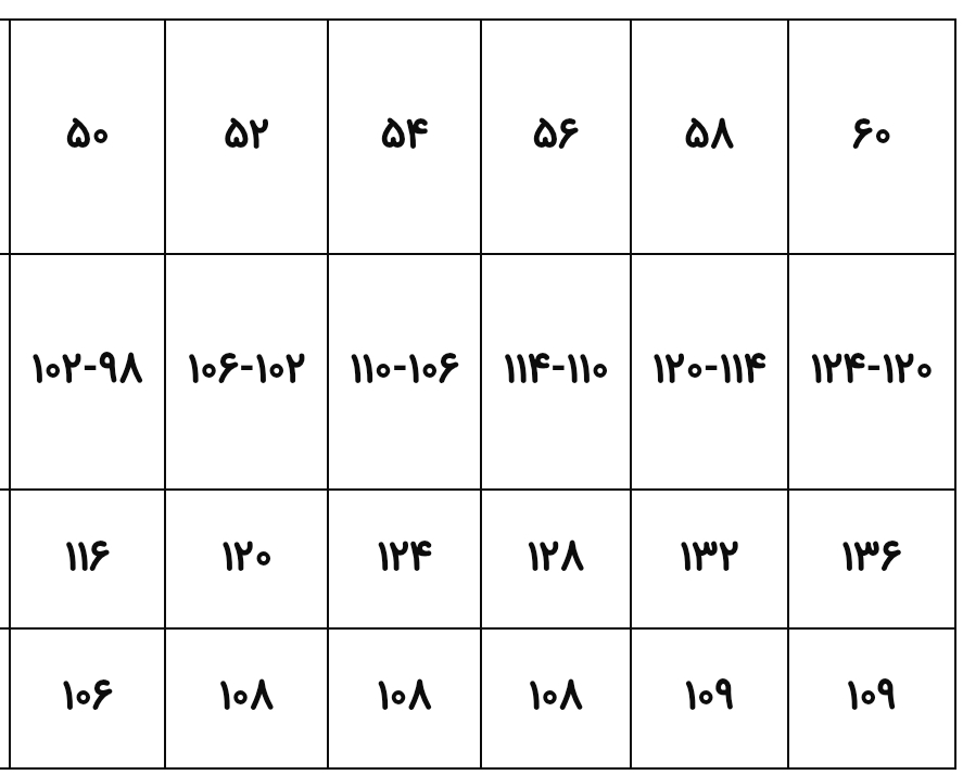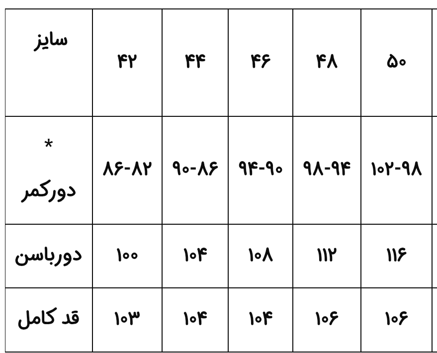 رنگ بندی: سبز،استخوانی،مشکی,قهوه ای,طوسی، سرمه ای: سایز بندی: 42,44,46,48,50,52,54,56,58,60