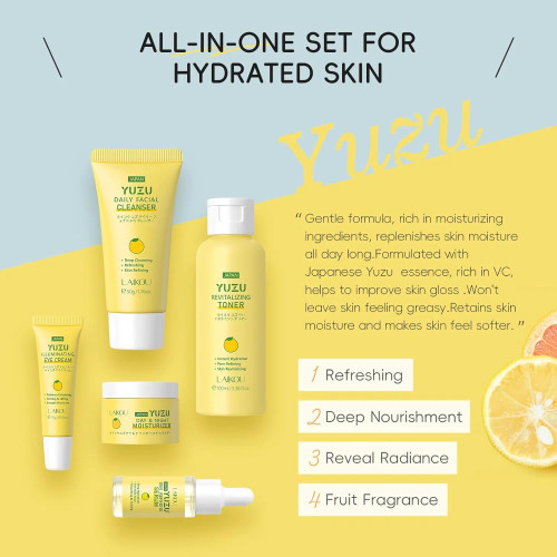 مجموعه مراقبت از پوست یوزو لایکو - مجموعه 5 تکه مراقبت روشن‌کننده و شفاف‌کننده پوست کاهش تیرگی و لکه‌های پوستی آبرسانی عمیق برای پوست نرم و لطیف حاوی ویتامین C و عصاره یوزو برای درخشندگی طبیعی کاهش خطوط ریز و نشانه‌های خستگی پوست فرمول ملایم، مناسب تمام انواع پوست کرم دور چشم حرفه‌ای برای کاهش پف و تیرگی روتین کامل ۵ مرحله‌ای مراقبت پوست در خانه تجربه حرفه‌ای و لوکس مراقبت پوست، مشابه پوست برای آقایان و بانوان، شامل پاک کننده، تونر، سرم، کرم دور چشم و مرطوب کننده برای پوست درخشان